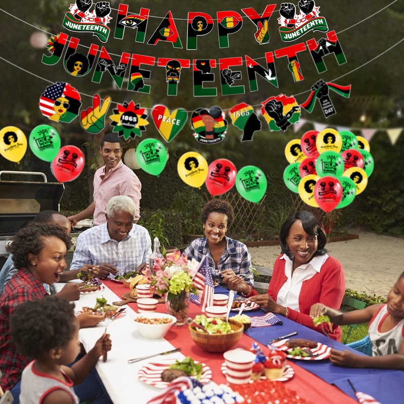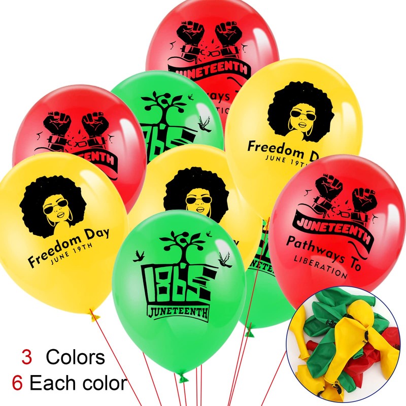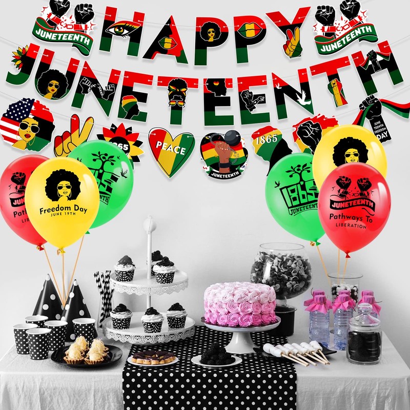 - Vivid Black Americans Freedom Design: Juneteenth decorations supplies printed with various Black Americans freedom day elements such as Raised fist, 1865, pathway to liberation, victory sign. Red, yellow and green Juneteenth balloons. The vivid colors and fun design will show warm welcome for all of the Juneteenth party guests!