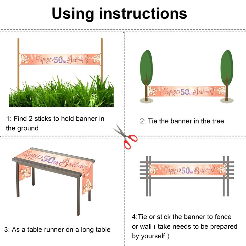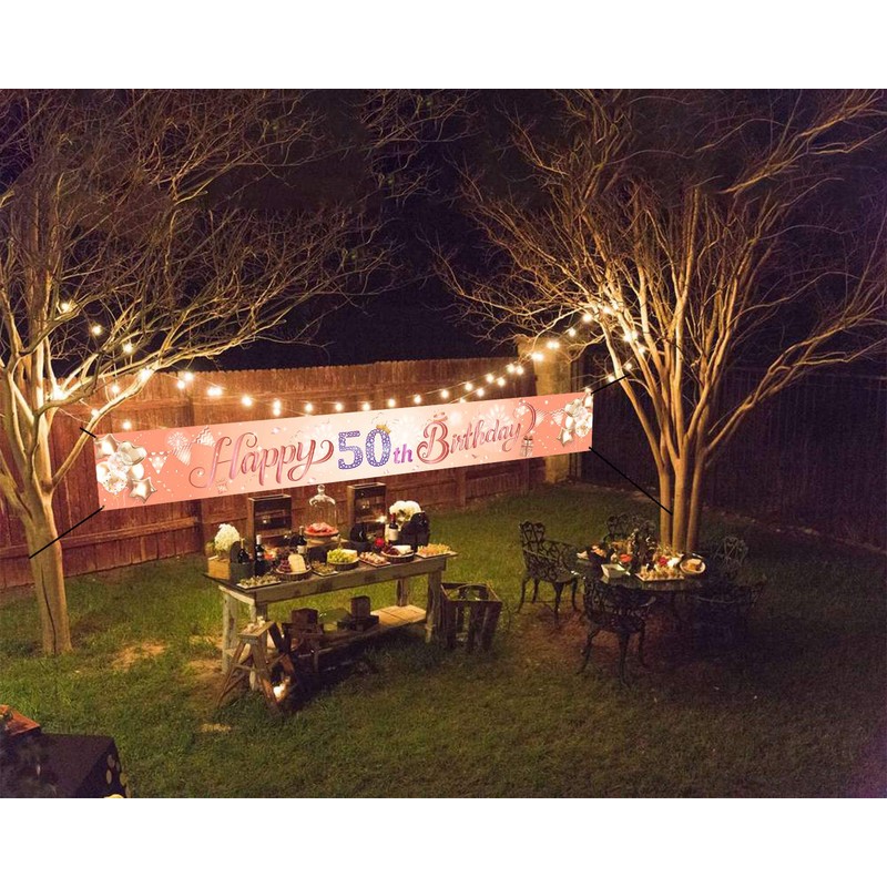 - 🎉【Women 50th Birthday Party Decoration】 Rose gold 50th birthday background fabric banner ideal for 50th birthday party decoration, 50th birthday welcome decoration. Hanging 50th birthday banner flag on indoor or outdoor, such as garden, house, fence, tablecloth, wall, room, door, ceiling, wallpaper, tree, table runner, photo backdrop, and so on.
