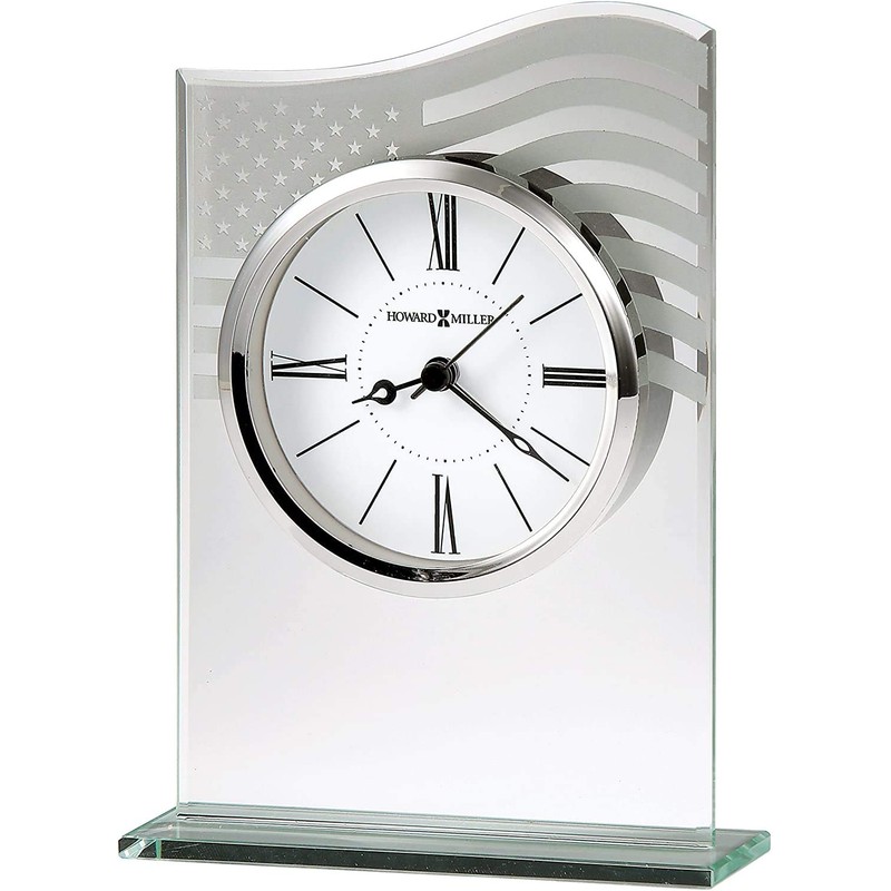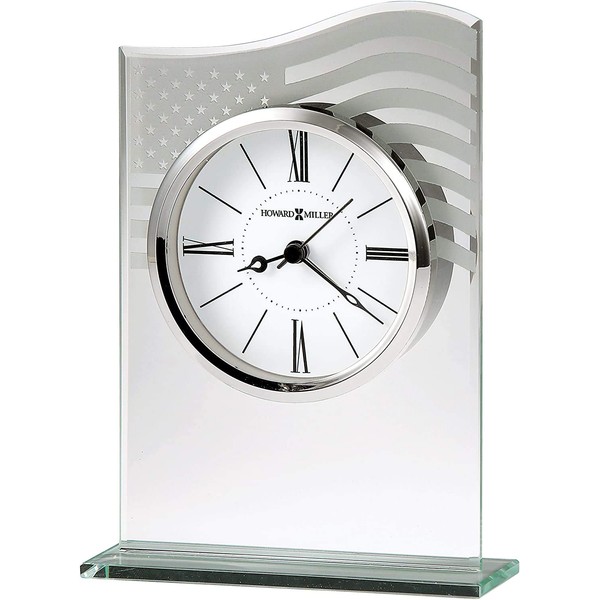 - TABLE CLOCK: The Liberty Table Clock is beveled and placed on a glass base including a sweeping top with an etched U.S. flag design to compliment your home decor. The clock’s quartz movement makes a soft ticking noise without the use of chimes for a quieter environment.