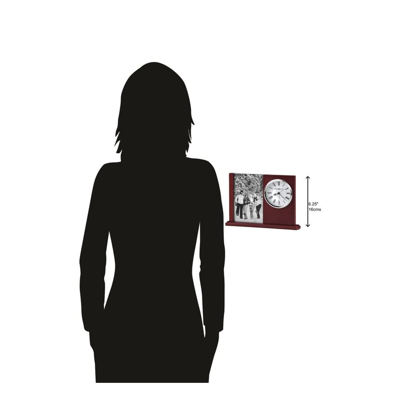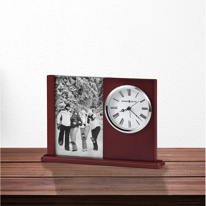 Howard Miller Portrait Caddy II Tabletop Clock – Wooden Photo Frame Clock with 4x6 Picture Holder, Quiet Ticking Quartz Alarm, Roman Numerals, Battery Operated, for Family