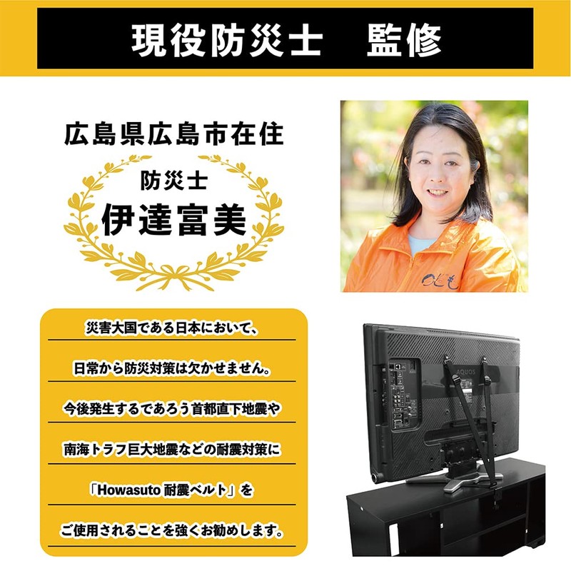 - (Active Disaster Prevention Manager) The Howasuto earthquake resistant belt is recommended by active disaster preparedness persons who have experienced large earthquakes