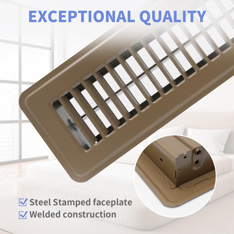 - Customizable Airflow Control: The 2" x 10" brown floor vent register offers efficient and reliable air circulation. With opposed blade dampers for easy airflow adjustment, it maximizes comfort and efficiency while operating quietly and without rattling, ensuring an optimal airflow experience.