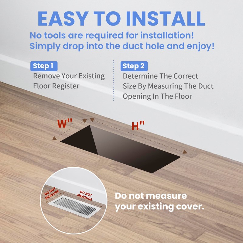 - Effortless Installation & Perfect Fit: The edge folding process guarantees a seamless fit with your floor, preventing tripping hazards. Installing the floor register is easy, no screws or tools are required - simply measure the size of your duct opening and order the corresponding size. Anyone can easily install.