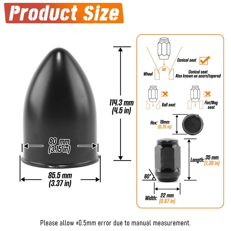 - 【LUG NUTS SET】- Thread size: 1/2-20, Hex size: 0.75 inch(19mm), Length: 1.38 inch(35mm), Width: 0.87 inch(22mm), Seat: Cone Seat.