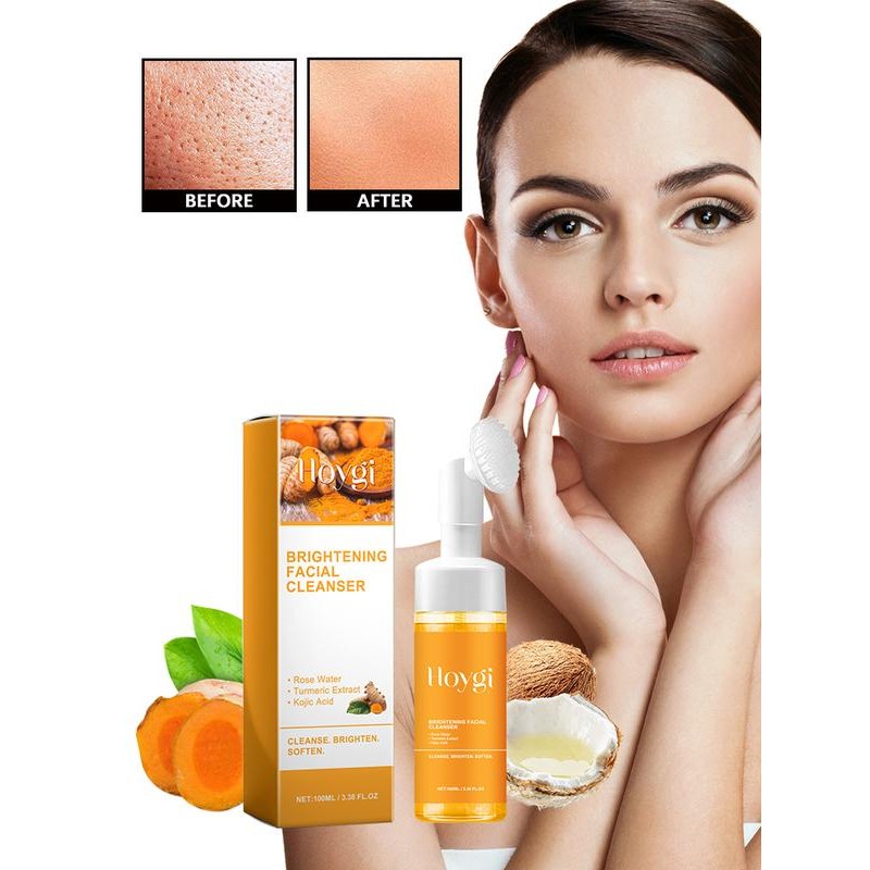 HOYGI Turmeric Face Wash with Kojic Acid & Rose Water - Gentle Foaming Formula for Soft Glowing Skin, Deep Cleansing Pore Minimizer, Travel Size Product - Squeeze, Brush Comfort Moisture turmeric facial cleanser turmeric skincare set travel size products