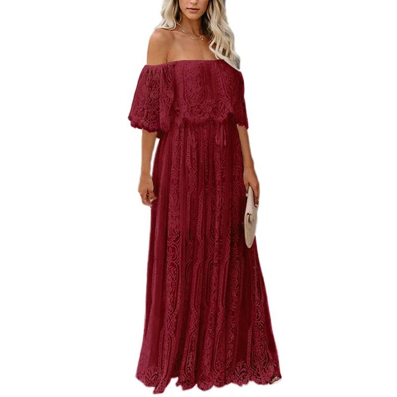 HOYISHION Womens Off Shoulder Floral Lace Maxi Wedding Dress Boho Burgundy Brides Bridesmaid Party Maternity Dresses