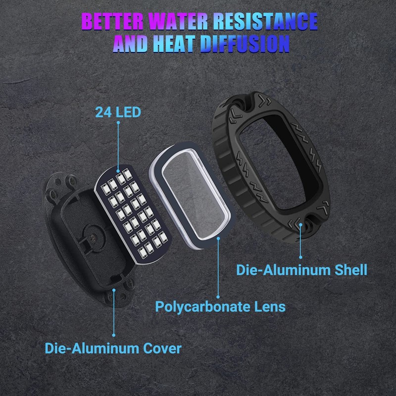 - 【Upgraded 24LEDs & Super Bright】RGB rock light features 4 x 6 high quality LED Chips each pod. Optimized brightness which is more Stable & Reliable. Has a 120° RGB beam wide viewing angle. Over 50,000 hour lifespan.