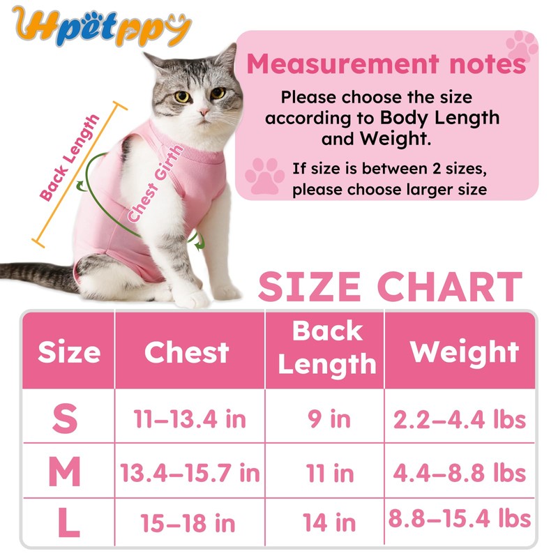 - 【Multiple Sizes】Cat neuter suit are suitable for female cats of different body shapes and breeds, Hpetppy cat surgical onesie offers 3 sizes for you to choose from, including S, M, and L. Size S fits cats 2-3.4 lbs; Size M fits cats 3.4-7 lbs; Size L fits cats 7-14 lbs. Please choose the right size according to the actual measurement, the size is for reference only, you need to measure your pet's size carefully before purchase."