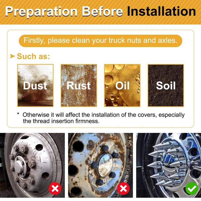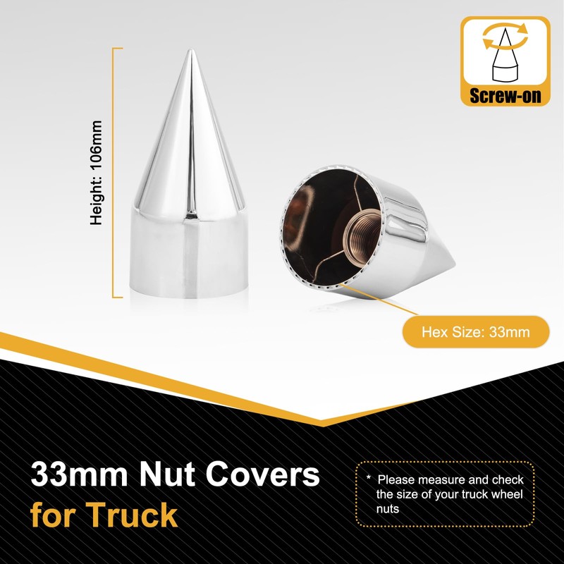 - 【Specification & Fitment】 Pointed lug nut covers: 33mm inside hex, 4 1/4" height, fits 32mm/33mm nuts. The kit quantity is 40. Please measure and check the size of your truck wheel nuts before purchasing.