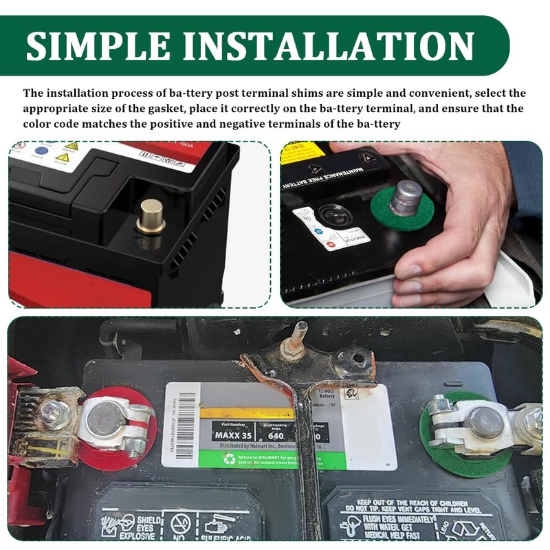 - Easy to Use:This battery terminal gasket features a color-coded design, with red indicating the positive terminal (+) and green indicating the negative terminal (-), making it easy to identify and use. Simply place the gasket directly on the correct battery terminal to complete installation