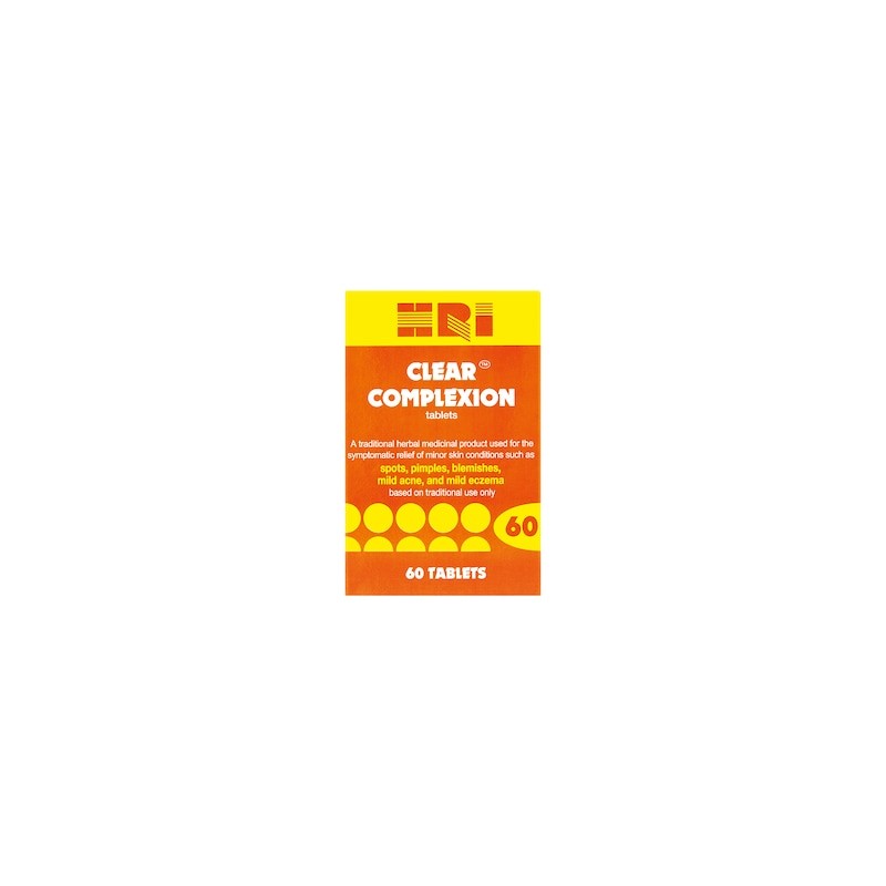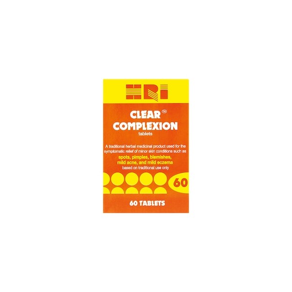 HRI Clear Complexion is a traditional herbal medicinal product used for the symptomatic relief of minor skin conditions such as spots, pimples, blemishes, mild acne, and mild eczema, based on traditional use only.