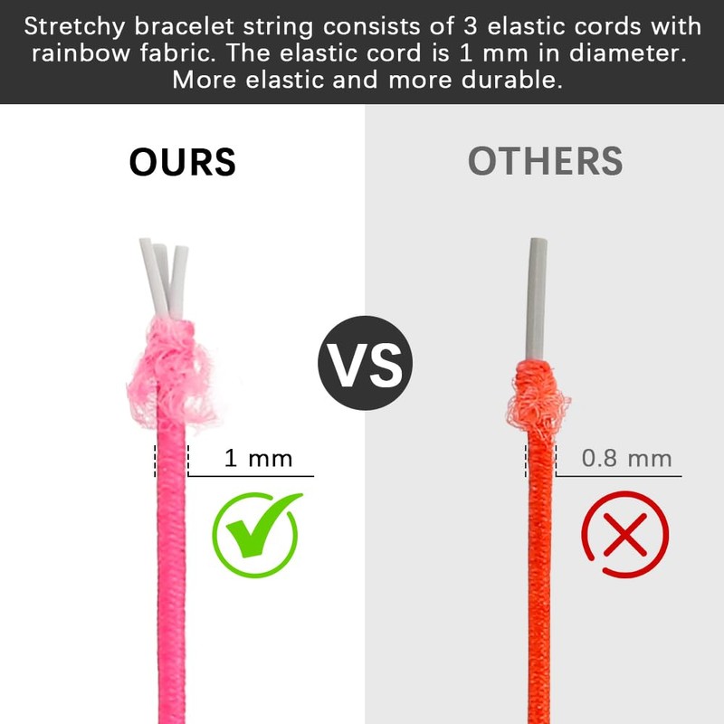 • HIGHLY ELASTIC: Stretchy bracelet string consists of 3 elastic cords with rainbow fabric. The elastic cord is 1 mm in diameter. More elastic. The length of 10 cm in the original state can be stretched to 21 cm. Elastic thread made of nylon polyester fabric material and braided rubber. The elastic cord fabric has a smooth texture, feels soft, and is comfortable to wear. Even if worn for a long time, the bracelet string will not choke or irritate the skin.