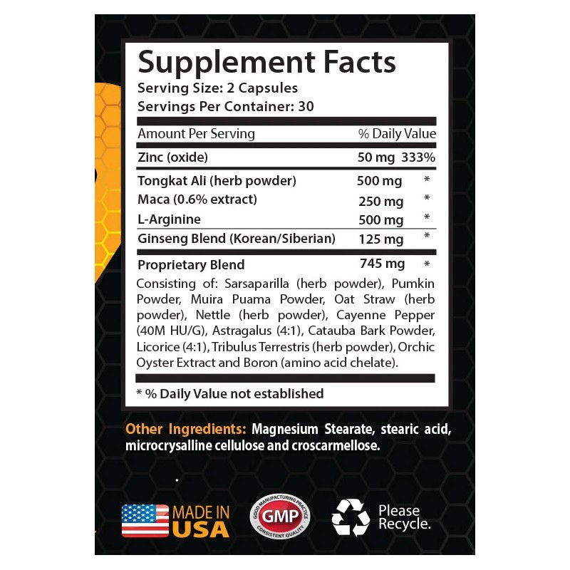 - Active Ingredients: Maca, Muira Puama (Ptychopetalum olacoides), Muira Puama Root, Muira Puama, Tribulus terrestris Extract, Horny Goat Weed, Oat Straw, Korean Ginseng