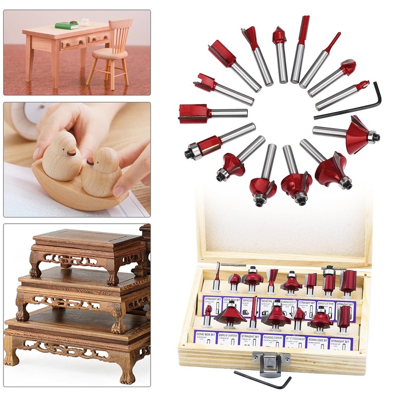 15PCS 1/4" carbon carbide shank router bits with wooden case. It is the best woodwroking helper for carpenters and hobbyists.