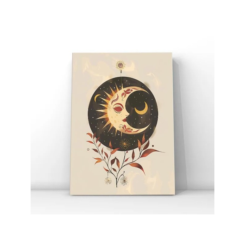 - MYSTICAL SUN & MOON ART: Invite a touch of cosmic wonder and bohemian charm into your space with this exquisite Sun and Moon canvas wall art print. This artwork presents a beautifully stylized depiction of celestial harmony, featuring a serene crescent moon nestled within a radiant sun. Both celestial bodies are adorned with delicate, intricate patterns and gentle facial features, giving them a mystical, almost dreamlike quality