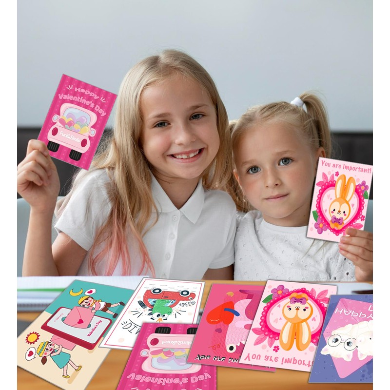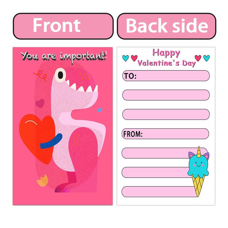 - 💌Various Styles-Our Valentine's Day kids cards are beautiful patterned and diverse. Card's front has pink dinosaur, bunny in heart wreath, pink candy car, cats in an envelope, a little boy and girl sharing letters and dino drive patterns, blessings such as "Happy Valentine's Day", "You are important!". Card's back is printed pink blank can be written. For older kids, they can use creativity to create a crafts cards, for younger kids, these card is cute, make a wonderful gift in their own right.
