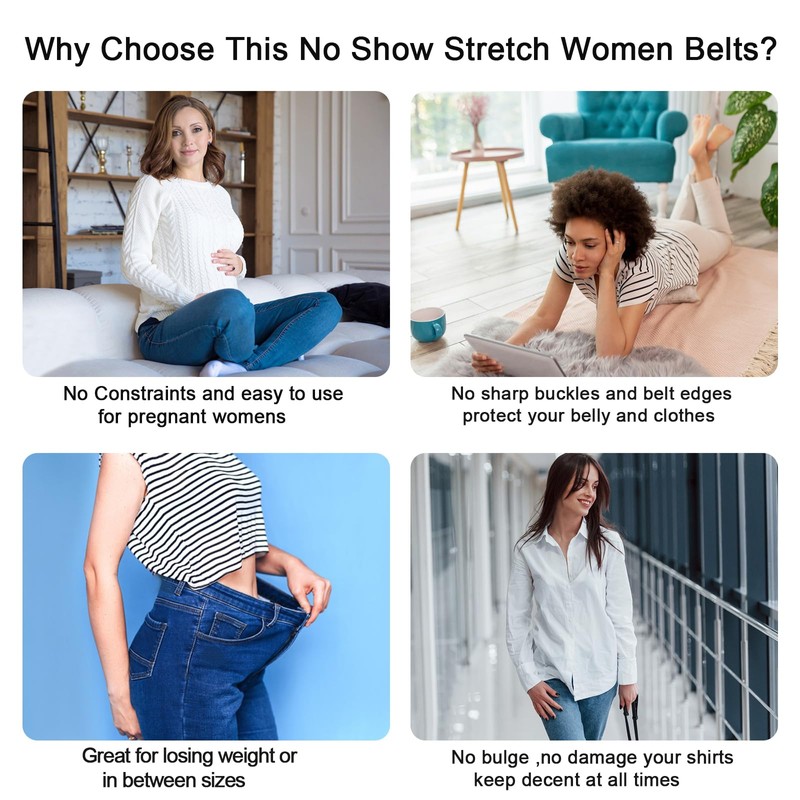 - ●Say goodbye to uncomfortable belts: Our No Show Women Men Belts are designed to provide ultimate comfort all day long. Made with elastic material, these belts are incredibly comfortable to wear and won't squeeze or irritate your skin. Whether you're sitting, bending, or moving around, our stretchy belts for women and men will stay in place and support your pants without causing any discomfort.
