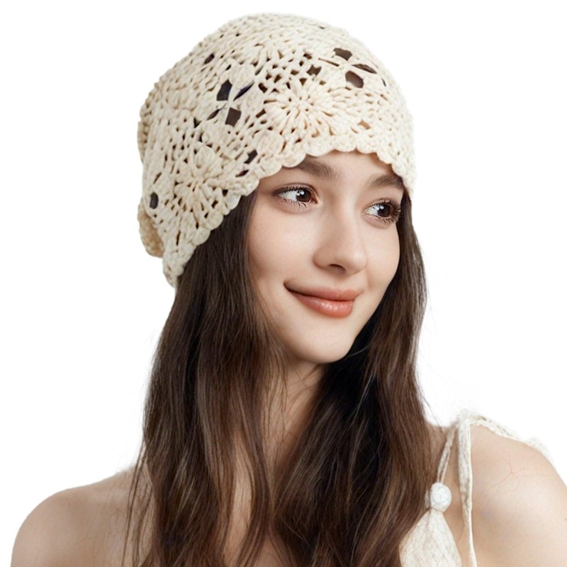 Hshsclth 100% Cotton Crochet Beanie Hat Handmade Knit Slouchy Floral Skull Hat Knitted Hollow-Out Summer hat for Women (US, Alpha, One Size, Ivory White)