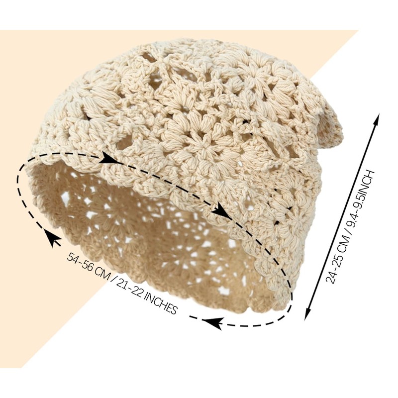 - One size fits most,the knitted hat for women has a circumference of 54-56 cm/21-22 inches and a depth of 24-25 cm/9.4-9.5 inches measured by hand. The natural elasticity of crochet cotton allows for slight stretching
