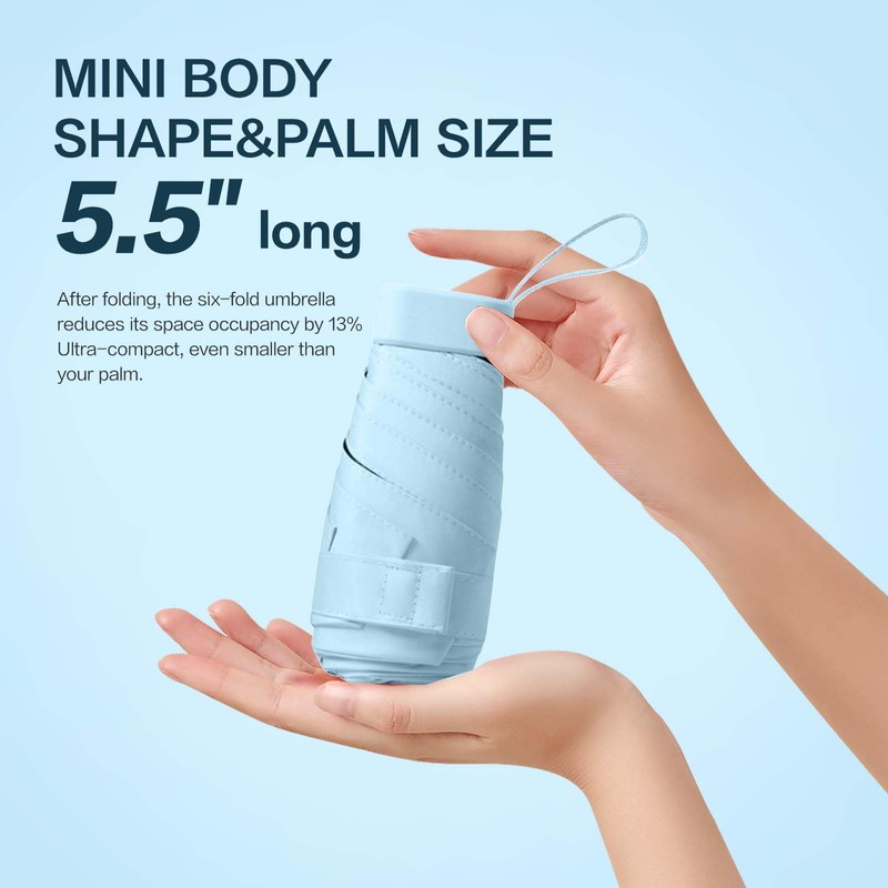 - LIGHTWEIGHT AND PORTABLE: Our mini parasol features a brand new design that weighs only 220 grams (0.48 lbs) and measures 6.7 inches in length when folded, making it smaller than other regular folding umbrellas. It fits perfectly in your handbag, purse or even pocket, making it ideal for a travel umbrella.