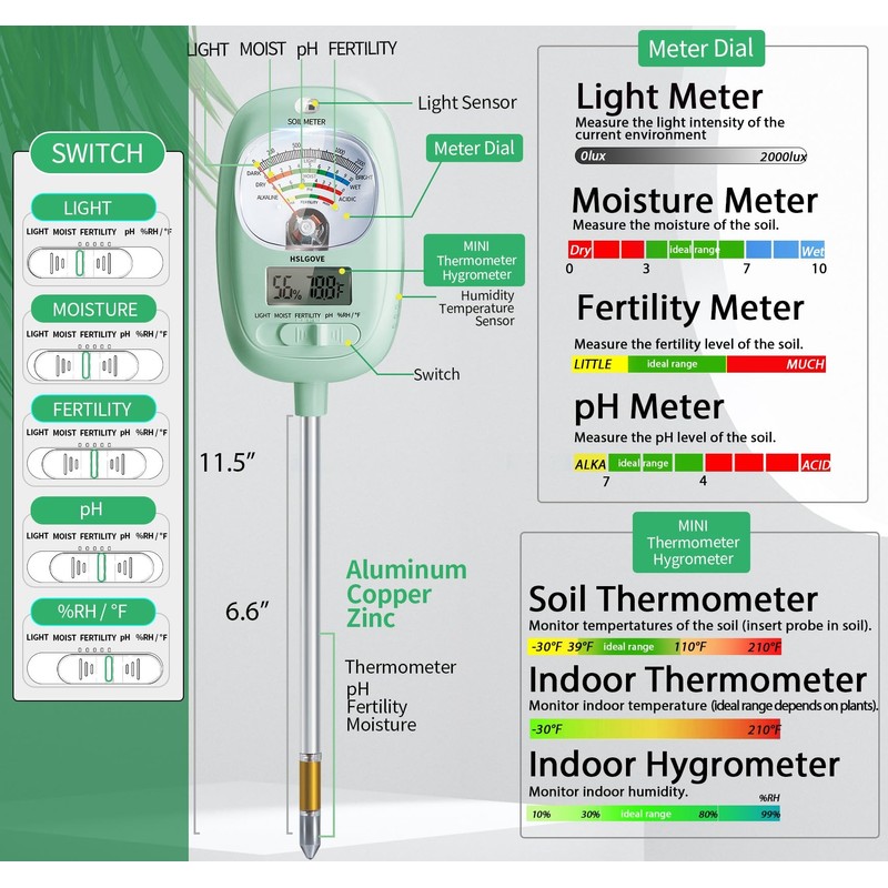 - Design Patented US&Utility Patented US: Innovate Dual-Dial with both soil meter & LCD soil thermometer/ air thermometer hygrometer. Help you to monitor soil moisture/pH/fertility/sunlight/ soil temp/air humidity/ soil temp in your garden all in one unit