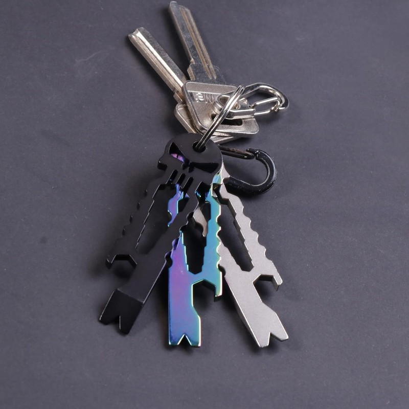 1. This multi-tool combines three functions in a small space: integrated in or on the keychain, wrench (4, 5, 5, 7, 8, 10 mm), bottle opener, lever. The stick is always at hand.