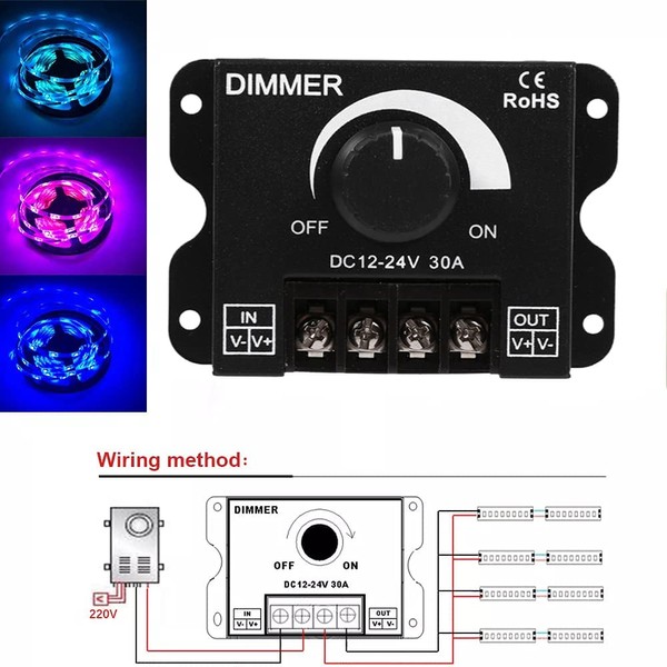 Hsthe Sea LED Switch Dimmer DC 12V-24V 30A PWM Dimmer Controller, Adjustable Brightness Light Switch Dimmer Controller for LED Strip Light