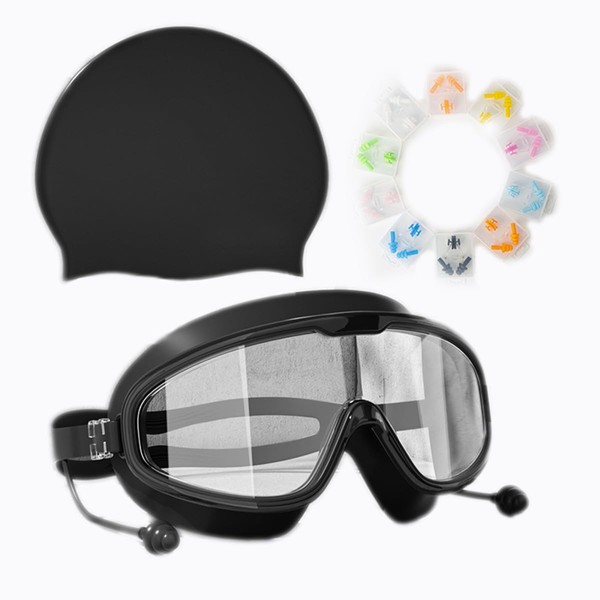 HSTWODE Swimming Goggles with Prescription 180° Panorama Swimming Goggles, Glasses Case, Swimming Cap, 10 Sets Nose Clip Earplugs, Adult Anti-Fog UV Protection Swimming Goggles (Black, -3.0)
