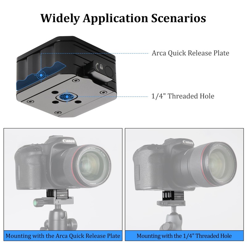 - Standard ¼"-20 Threading Screw: This mount plate comes with a top 1/4" screw for DSLR, mirrorless cameras, telephoto lenses, sliders, phone mounts, cell phone holders, action camera and more.