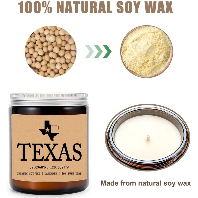 - 100% natural soy wax; Scented soy candle is made from natural soy wax; Soy wax provides a slower and cleaner burn than paraffin, which is better for environment, burns more sufficiently and longer.