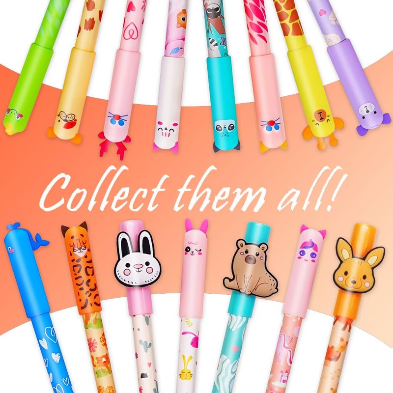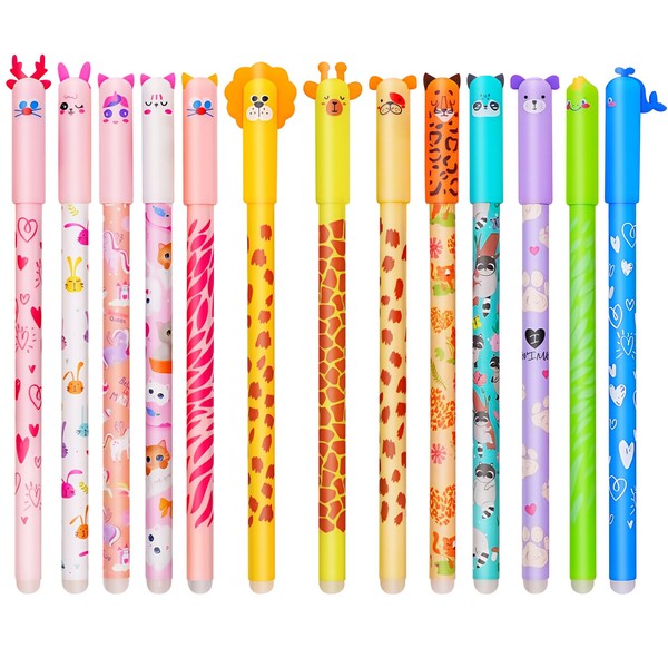 - GIFT IDEA: What better way to express affection for someone than with an erasable pen? Thanks to their cute designs, these erasable pens are a gift that adds colour to the greyest days! Set of erasable gel pens with the following designs & ink colours: Dinosaur (green ink), Cat (black ink), Elephant (blue ink), Giraffe (yellow ink), Lion (beige ink), Penguin (black ink), Panda (white ink), Unicorn (white ink), Rabbit (beige ink), Tiger (orange ink), Bee (yellow ink), Koala (gray ink)