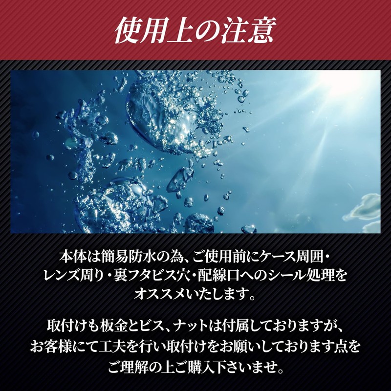 - Since the main unit is simple and waterproof, we recommend sealing the case around the lens, the back lid hole and the wiring port before use. Installation is also included with the sheet metal, screws, and nuts, but please understand that we have done the effort to install this product before purchasing