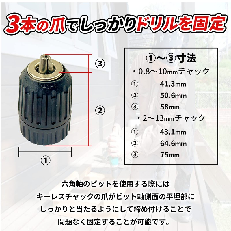 - The tip of the drill chuck is secured by 3 claws. By opening and closing the nail, it can accommodate a wide range of axes from 2mm to 13mm