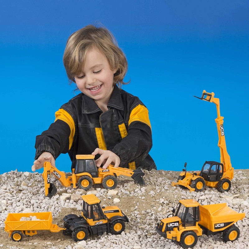 - HOURS OF CONSTRUCTION FUN - Scale replica JCB vehicle with die-cast parts. There are 5 different vehicles to collect! Backhoe Loader, Dumptruck, Fastrac & Trailer and Loadall! Children will love this JCB vehicle and can spend hours having fun playing with them.