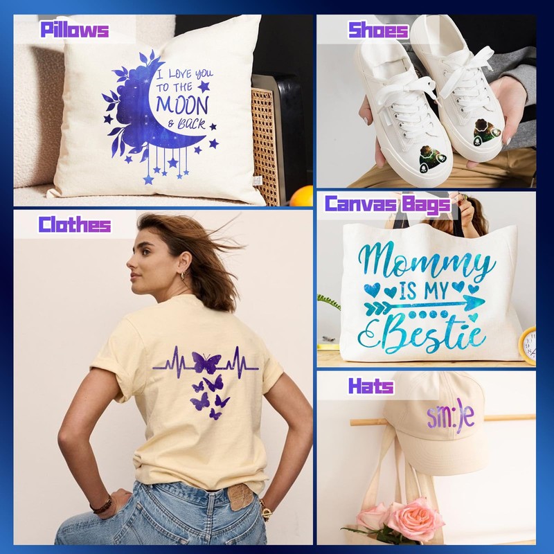 - ??Customizable & Widely UseThis galaxy iron on vinyl bundle is suitable for most cutting machines, creating galaxy projects on fabrics such as pure cotton, polyester blends and even athletic mesh fabrics, maximize your creative inspiration. Personalize your custom t-shirts, tote bags, caps, aprons, pillows and more with HTVRONT vinyl