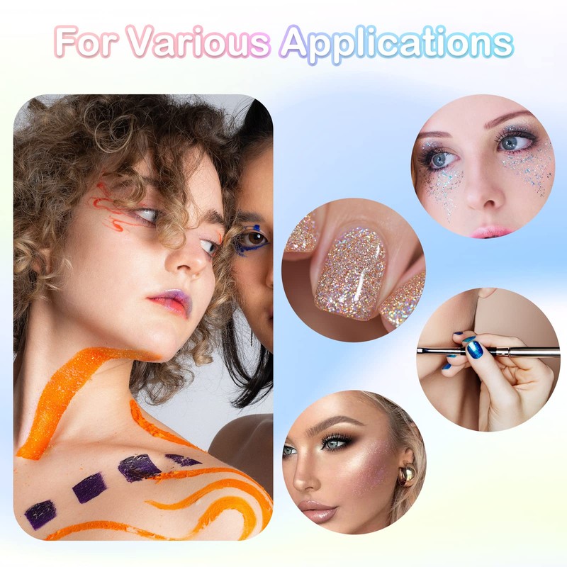 - Broad Application: With this bulk glitter that can dot many scenarios, more and more innovative uses are found by craft lovers. You can use this fine glitter for nails to decorate resin projects, makeup, nails, hair, body art, cards, phone cases, tumblers, etc. Perfect for enhancing the brilliance trenchancy of projects made of glitter powder