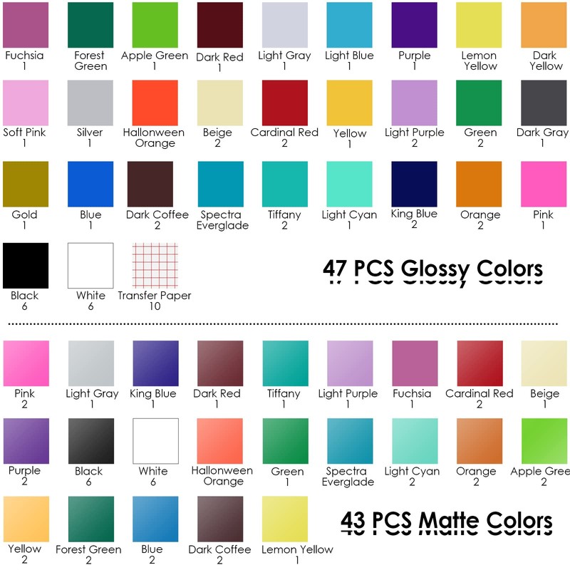 - [Package Include] This permanent vinyl bundle includes 90 permanent vinyl sheets, 10 transfer tape for vinyl, and 1 free squeegee. This permanent adhesive vinyl set has 47 glossy vinyl sheets and 43 matte vinyl sheets which size is 12 inches x 12 inches. Total 52 different colors. A nice choice for you to run your business or do some big projects.