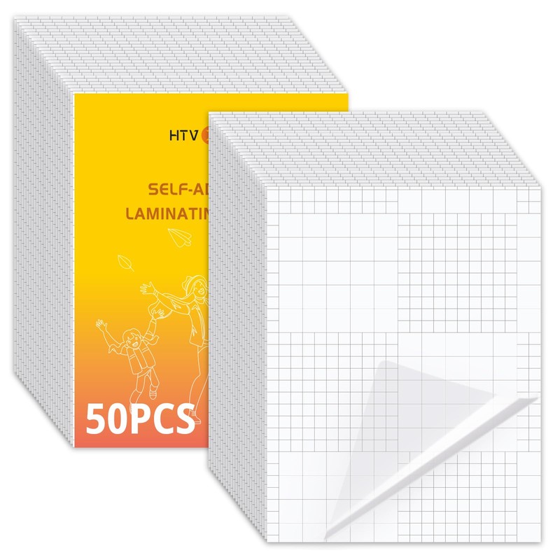 - đăLARGER SIZEăHTVRONT sticker laminating sheets has a 9 * 12 " larger size, which differs from regular sheets. The convenient grid on self-sealing laminating sheets allows you to easily align and cut the essential documents. Besides, you can effortlessly peel off the backing by gently folding the corners. Note: the self-sealing laminating sheets are single adhesive on the side. So, if you need to laminate both sides, you should use two sheets.