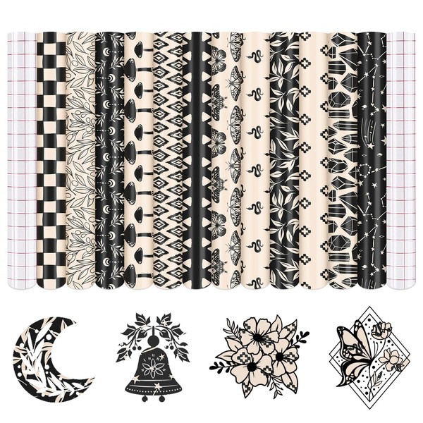 HTVSTD Boho Permanent Adhesive Vinyl-12 Sheets 12 * 10inches Black and IvoryPattern Self Adhesive Vinyl Water proofing Permanent Vinyl for Mugs Vinyl Compatible with Sillhoutte Cameo and Cricut