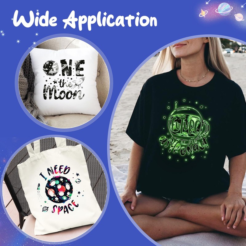 - 【Special Patterns Glow in the Dark】We mainly offered the special patterned HTV to you , There are 6 sheets different space patterned glow in the dark HTV include , You can crafting any items you may like to design on the fabric