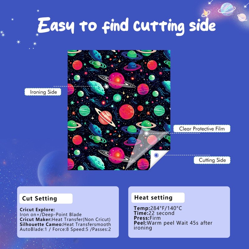 - 【WIDELY TRANSFER】This space patterned iron on vinyl can be use to do your own design of T-shirts, shoes, caps, bags,handbag, pillows and so on. Widely applied on many fabric for cotton, polyester and cotton fabrics.