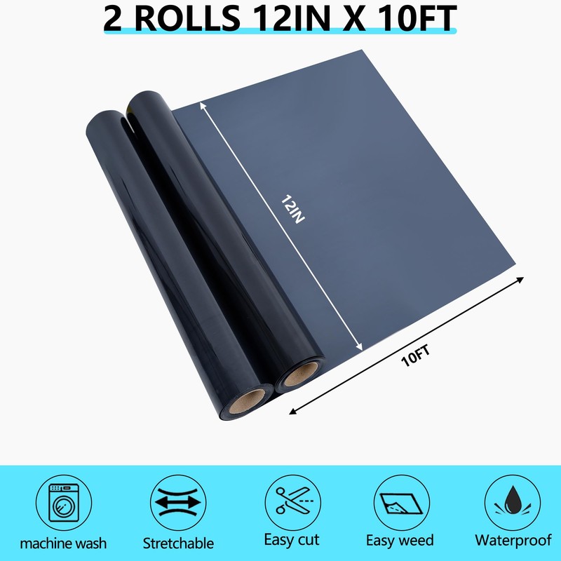 HTVVETUR - Rollo de vinilo de transferencia de calor, 2 rollos de vinilo HTV negro de 12 x 10 pies, para camisas, vinilo para planchar para cameo, fácil de cortar y deshierbar (negro, 20 pies)