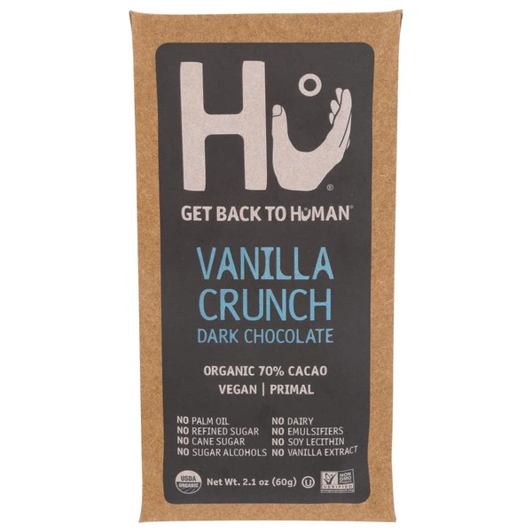 Hu - Organic Dark Chocolate Bar Vanilla Quinoa Qrispy Vanilla And Quinoa Walk Into A Bar (Of Chocolate). Hu Organic Dark Chocolate Bar Vanilla Quinoa Qrispy Is A New, Healthy Twist On Crunchy Chocolate Bars. Hu's Smooth 70% Dark Chocolate Mixed With The Subtle Sweetness Of Real Vanilla Bean Powder (No Extracts Or Artificial Flavors Here!). Layered Puffed Quinoa Provides A Satisfying Crispy Texture (Gluten Free). Light And Satisfying, The Bar Is Sure To Please! No Gluten, Cane Sugar, Dairy No Refined Sugar, Sugar Alcohols No Soy Lecithin, Emulsifiers,gmo's Vegan, Paleo About Hu The Goal Isn't To Just Get By. The Goal Is To Live Actively, Age Gracefully, And Flourish. They Are Inspired By Quality Foods Ability To Heal Versus Poor Quality Foods Guarantee To Hinder. They Started Hu To Help People Get Back To Eating, Living, And Thriving Like Humans. This Is How People Get Back To Human. How Did They Get To Hu? their Journey To get Back To Human Started Where Many People Are Today: A Bit Groggy, Run-Down, And Over-Caffeinated. Even Though They Were Living A healthy Lifestyle - No Junk Food, Some Exercise, And Some Label Reading - They Weren't Really Thriving. So Jordan, Their Co-Founder And Corporate Defector (He Didn't Come From The Food Industry, But He's In Deep Now), Immersed Himself In All Things Food: The Gut-Brain Connection, Systemic Inflammation, The Impact Of Certain Foods And Additives Onpeople's Health, And Where Potentially Harmful Things Are Hiding Inthe Food Supply. First, He Cut Gluten. In Just A Few Days, An Annoying Skin Condition He Had Dealt With For Years Completely Disappeared. He Was Hooked. Second, He Went Primal. In Addition To Kicking Gluten To The Curb, Gone Were Soy, Cane Sugar, Cheap 'vegetable' Oils And Canola Oil, Poor-Quality Meats And Fish, Grains, And Dairy. He Became Sharper, Leaner, More Focused - He Felt Incredible. Third, Jordan Started Asking Questions At His Favorite Restaurants Like,