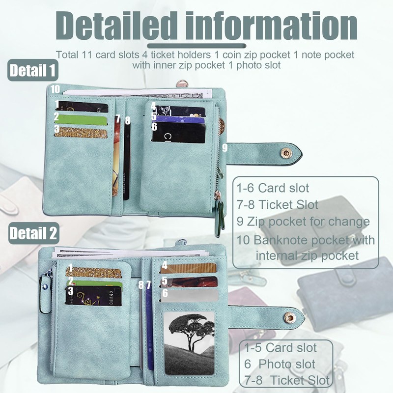 - 【Large Capacity】 The small wallet for woman has a large capacity. It comes in 11 card slots, 4 ticket slots, 2 zipper coin pockets, 1 large cash slot, and 1 ID window slot, enough to hold your cash, coins and various cards.