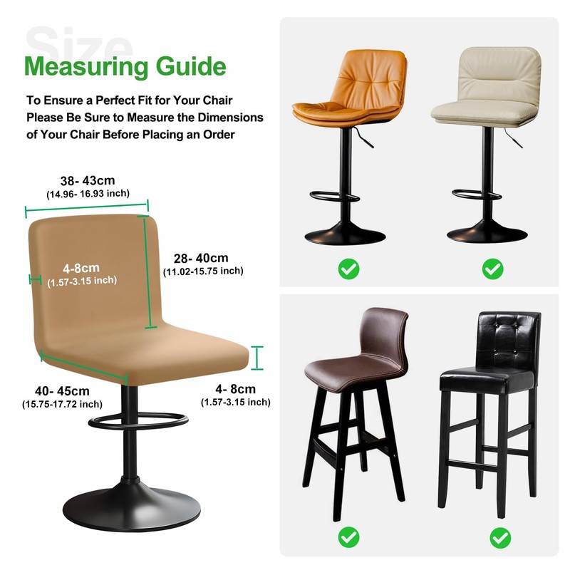 - Size adjustment: bar stool covers with back are suitable for most high chairs. Backrest height: 28-40 centimeters, seat cushion length: 40-45 centimeters, seat cushion width: 38-43 centimeters, back thickness: 4-8 centimeters. Please measure the size of the chair before purchasing. Packaging: 1 or 2 or 4 pieces (excluding chair)