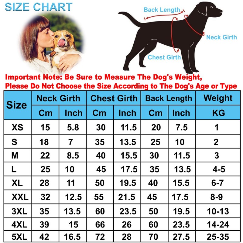 - Please note: If you have problems with the size, please measure the perfect body shape of your pet before purchasing: Neck circumference, chest, back length, weight and choose the right size according to our size chart If your pet is growing or has very long hair, please choose a larger size