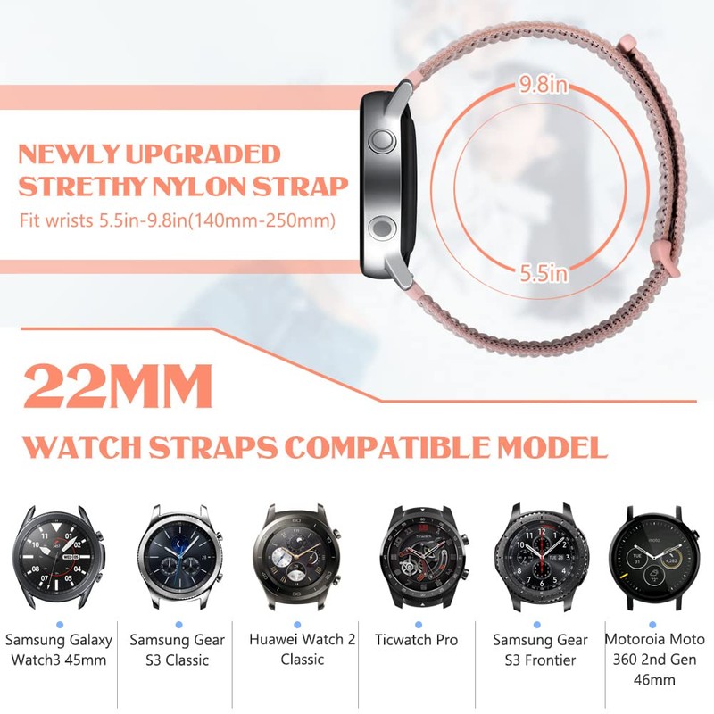 - Compatible models: Huamanlou nylon strap, suitable for almost all watches with 22 mm lugs, such as Samsung Galaxy Watch 3 45 mm; Samsung Galaxy Watch (46 mm); Samsung Gear S3 Classic/Frontier; Garmin Vivoactive 4; Huawei Watch 2 Classic; LG Watch/Urbane/R/W7; Moto 360 2nd Gen 46 mm; Pebble Classic/Time/Time Steel/2/2 SE.