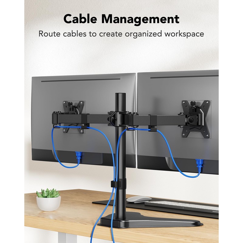 • Cable Management & Easy Assembly - This free standing dual monitor stand comes with clips on the arms and center pole for tidy cable management, keeping your cable clean and making your desk neat. Go with the installation manual, this dual monitor arm is super easy to install. Please make sure two arms are balanced. You can also choose to mounting with grommet for better stability.