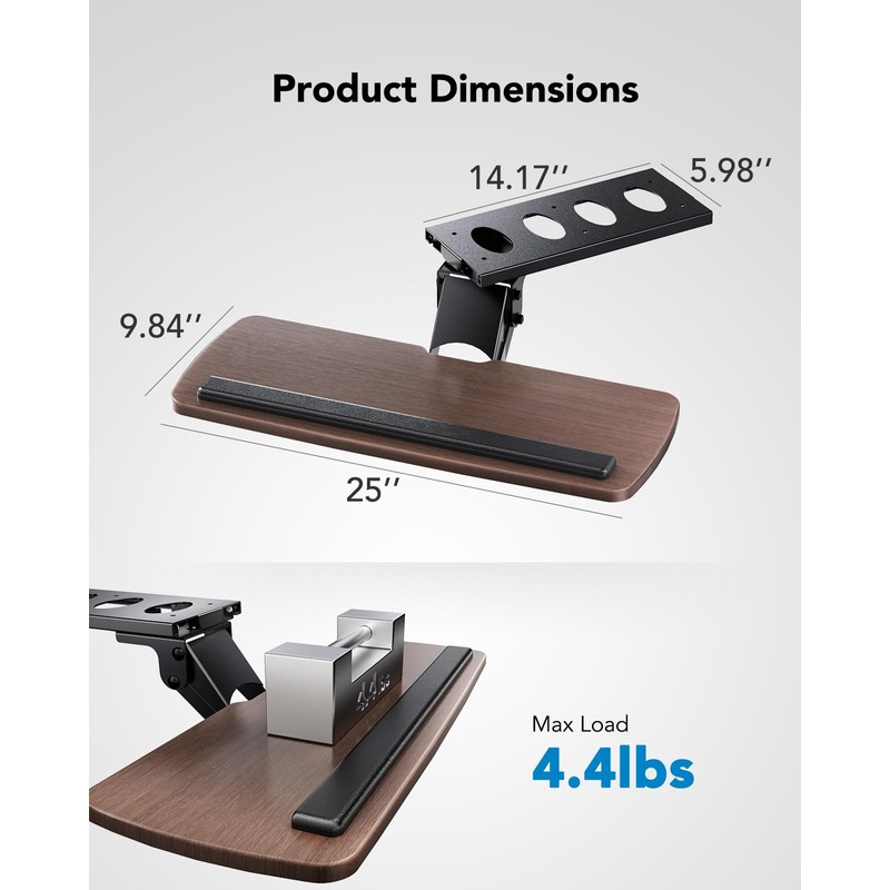 - Deluxe Universal - Comes with a 25" x 9.8" smooth and large surface. This desk mount keyboard tray provides plenty of space for a full-size keyboard and a mouse side by side. Gel wrist rest pad help with arm and wrist strain.
