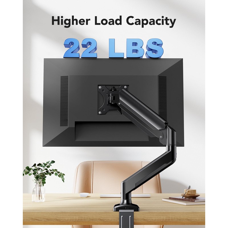 - Superior Weight Capacity: Made of aerospace-grade aluminum alloy with a gas springcore tested to withstand 20,000 lift cycles, our single monitor arm provides excellent stability for between 4.4-22 lbs. Compared to other single monitor mount that can only support up to 17.6 lbs, this single monitor mount provides reliable support for your screen